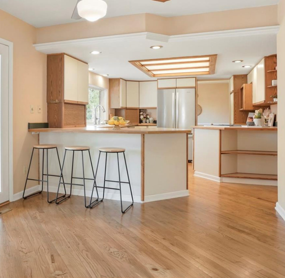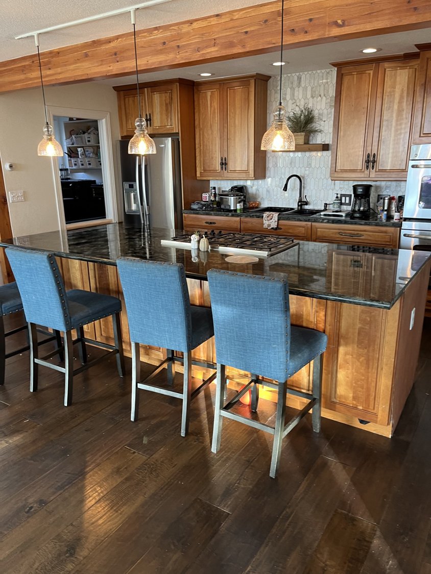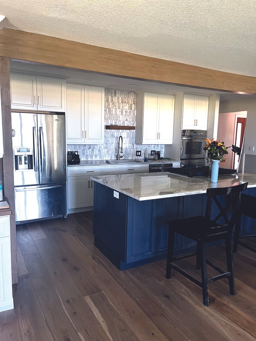No cabinets were replaced savings of many many thousands. The wall cabinets were painted white. The island cabinets were painted a country blue. New flooring was needed due to water damage. The new flooring was a lighter tones. The beam was sanded and stained to match the new floor color. New countertops, faucet, and door / drawer pulls. The backsplash is now a beautiful focal point and everything matches wonderfully.
