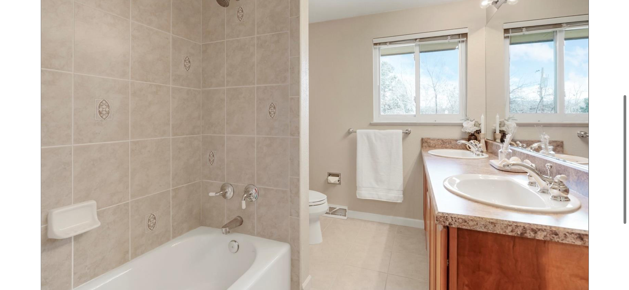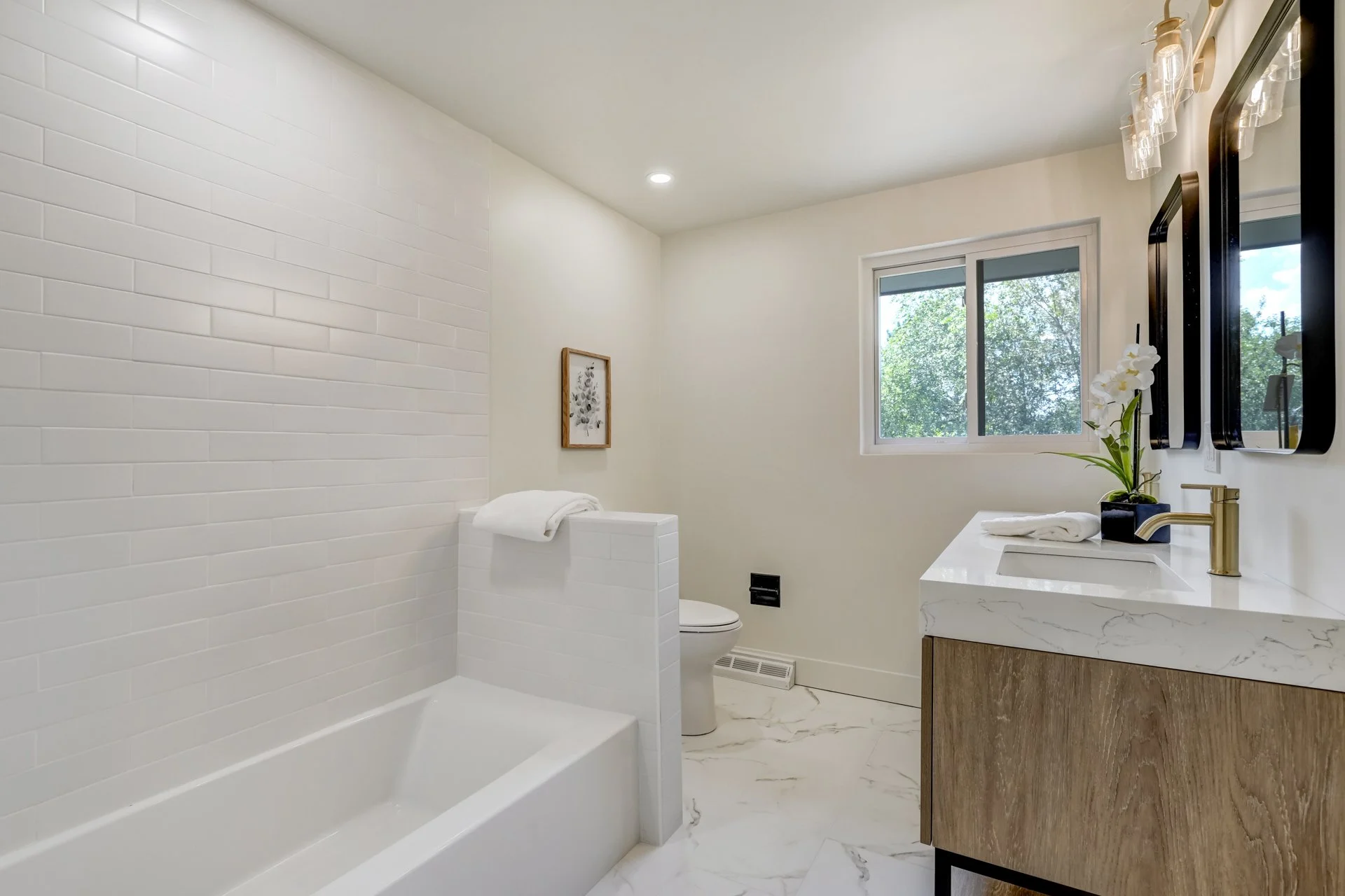 Hallway bath of fair size but a bit out dated and not the open feel that is so trendy today. Removed the top half of the side shower wall to make a half wall - so the shower will now have natural light coming in. Moved the shower head and faucets to the opposite wall. Brighter and more welcoming.