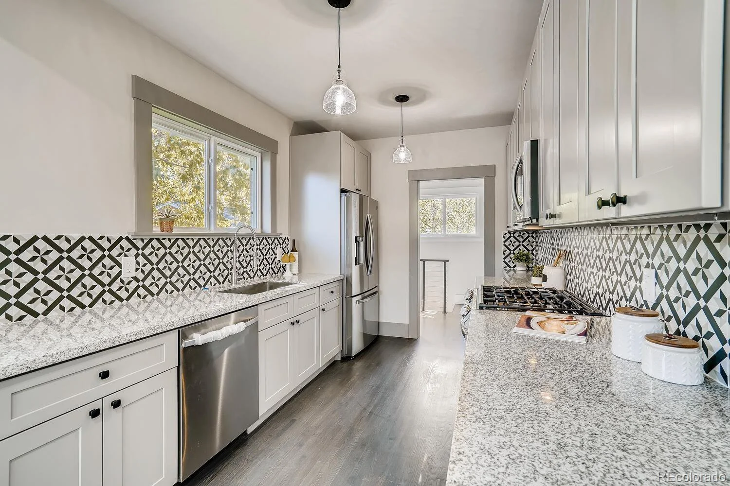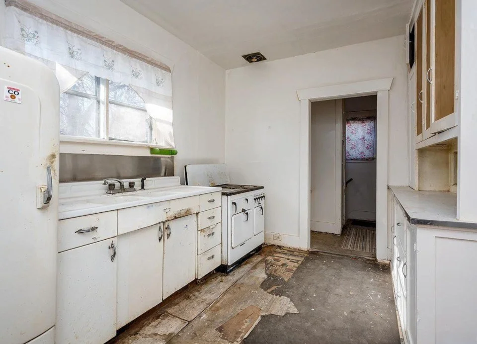 After years of neglect, the house was abandoned. The home was in such disrepair, utilities could not be turned on. Everything is new in this kitchen! The stove was moved to the opposite wall. The refrigerator was moved further down the row. New flooring. New pendant lighting. The wall that separated the kitchen was removed creating an open and welcoming feel.